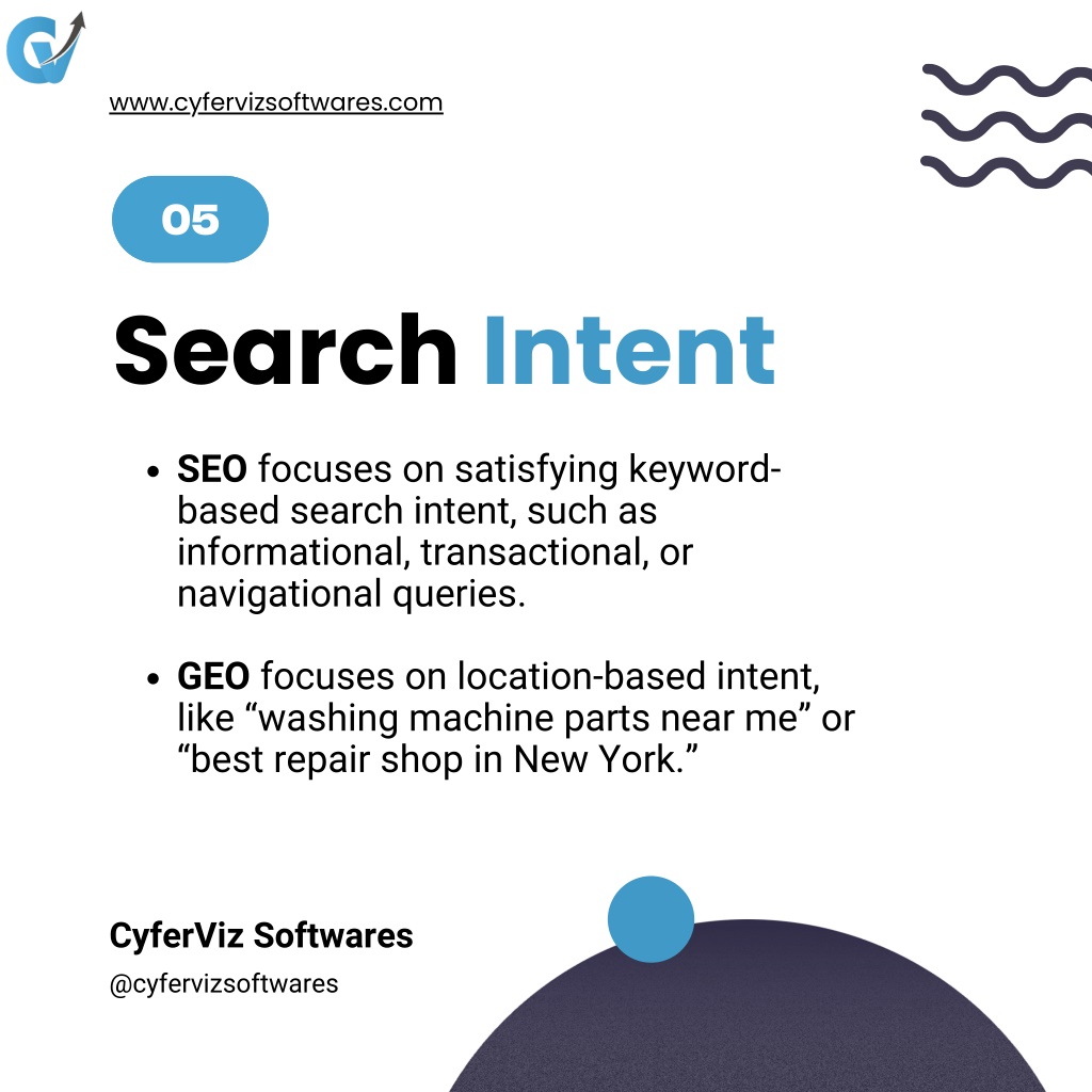 www.cyfervizsoftwares.com 05 Search Intent SEO focuses on satisfying keyword- based search intent, such as informational, transactional, or navigational queries. GEO focuses on location-based intent, like “washing machine parts near me” or “best repair shop in New York.” CyferViz Softwares @cyfervizsoftwares