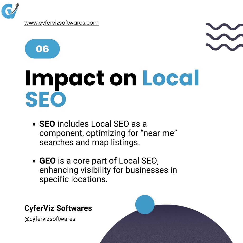 www.cyfervizsoftwares.com 06 Impact on Local SEO SEO includes Local SEO as a component, optimizing for “near me” searches and map listings. GEO is a core part of Local SEO, enhancing visibility for businesses in specific locations. CyferViz Softwares @cyfervizsoftwares
