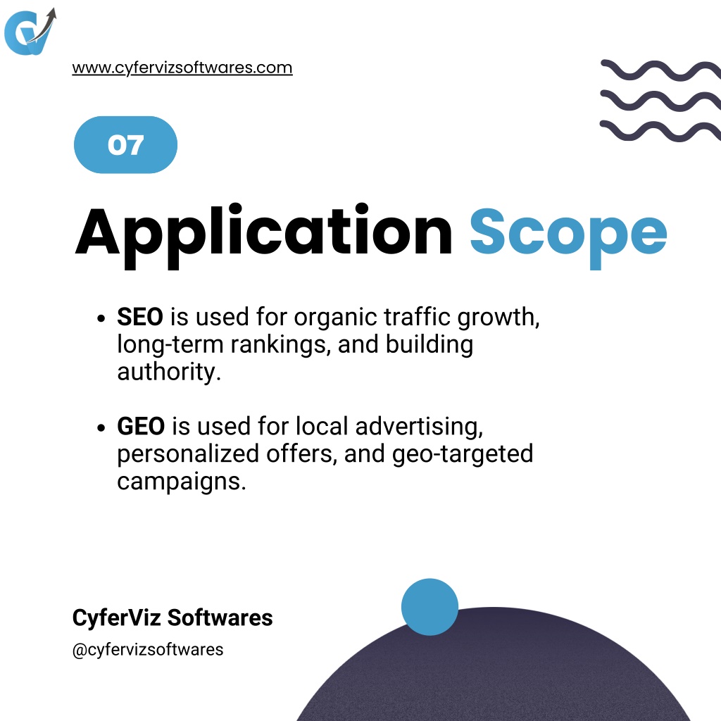 www.cyfervizsoftwares.com 07 Application Scope SEO is used for organic traffic growth, long-term rankings, and building authority. GEO is used for local advertising, personalized offers, and geo-targeted campaigns. CyferViz Softwares @cyfervizsoftwares