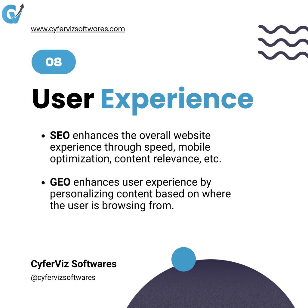 www.cyfervizsoftwares.com 08 User Experience SEO enhances the overall website experience through speed, mobile optimization, content relevance, etc. GEO enhances user experience by personalizing content based on where the user is browsing from. CyferViz Softwares @cyfervizsoftwares