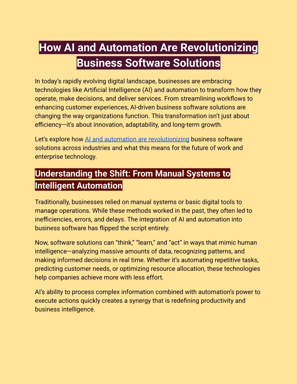 How AI and Automation Are Revolutionizing Business Software Solutions In today’s rapidly evolving digital landscape, businesses are embracing technologies like Artificial Intelligence (AI) and automation to transform how they operate, make decisions, and deliver services. From streamlining workflows to enhancing customer experiences, AI-driven business software solutions are changing the way organizations function. This transformation isn’t just about efficiency—it’s about innovation, adaptability, and long-term growth. Let’s explore how AI and automation are revolutionizing business software solutions across industries and what this means for the future of work and enterprise technology. Understanding the Shift: From Manual Systems to Intelligent Automation Traditionally, businesses relied on manual systems or basic digital tools to manage operations. While these methods worked in the past, they often led to inefficiencies, errors, and delays. The integration of AI and automation into business software has flipped the script entirely. Now, software solutions can “think,” “learn,” and “act” in ways that mimic human intelligence—analyzing massive amounts of data, recognizing patterns, and making informed decisions in real time. Whether it’s automating repetitive tasks, predicting customer needs, or optimizing resource allocation, these technologies help companies achieve more with less effort. AI’s ability to process complex information combined with automation’s power to execute actions quickly creates a synergy that is redefining productivity and business intelligence.
