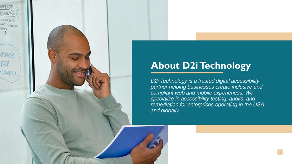 About D2i Technology D2i Technology is a trusted digital accessibility partner helping businesses create inclusive and compliant web and mobile experiences. We specialize in accessibility testing, audits, and remediation for enterprises operating in the USA and globally.