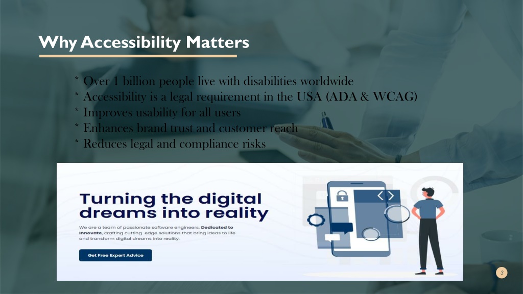Why Accessibility Matters * Over 1 billion people live with disabilities worldwide * Accessibility is a legal requirement in the USA (ADA & WCAG) * Improves usability for all users * Enhances brand trust and customer reach * Reduces legal and compliance risks