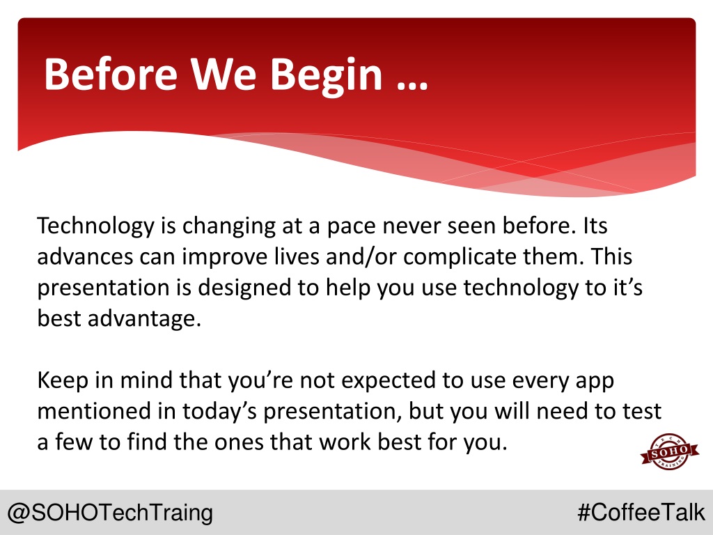 Before We Begin … Technology is changing at a pace never seen before. Its advances can improve lives and/or complicate them. This presentation is designed to help you use technology to it’s best advantage. Keep in mind that you’re not expected to use every app mentioned in today’s presentation, but you will need to test a few to find the ones that work best for you. • @SOHOTechTraing #CoffeeTalk