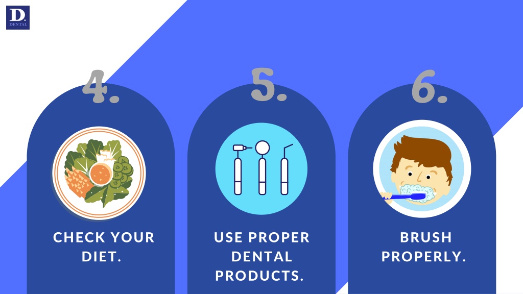 5. 4. 6. CHECK YOUR DIET. USE PROPER DENTAL PRODUCTS. BRUSH PROPERLY.