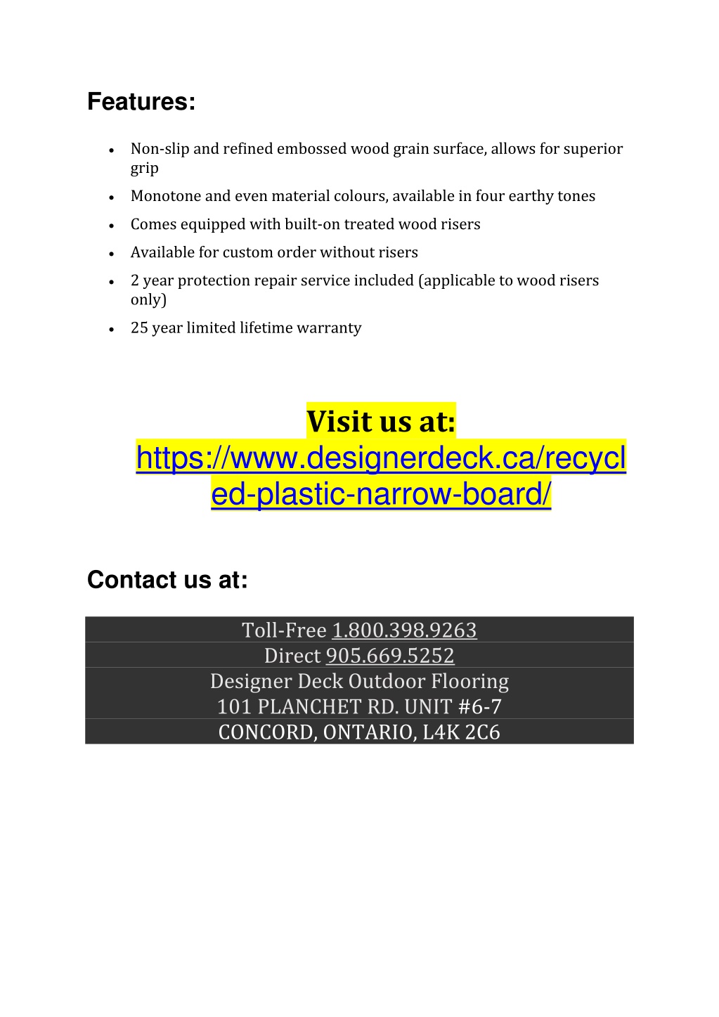 3. Features: •Non-slip and refined embossed wood grain surface, allows for superior grip •Monotone and even material colours, available in four earthy tones •Comes equipped with built-on treated wood risers •Available for custom order without risers •2 year protection repair service included (applicable to wood risers only) •25 year limited lifetime warranty Visit us at: https://www.designerdeck.ca/recycl ed-plastic-narrow-board/ Contact us at: Toll-Free 1.800.398.9263 Direct 905.669.5252 Designer Deck Outdoor Flooring 101 PLANCHET RD. UNIT #6-7 CONCORD, ONTARIO, L4K 2C6