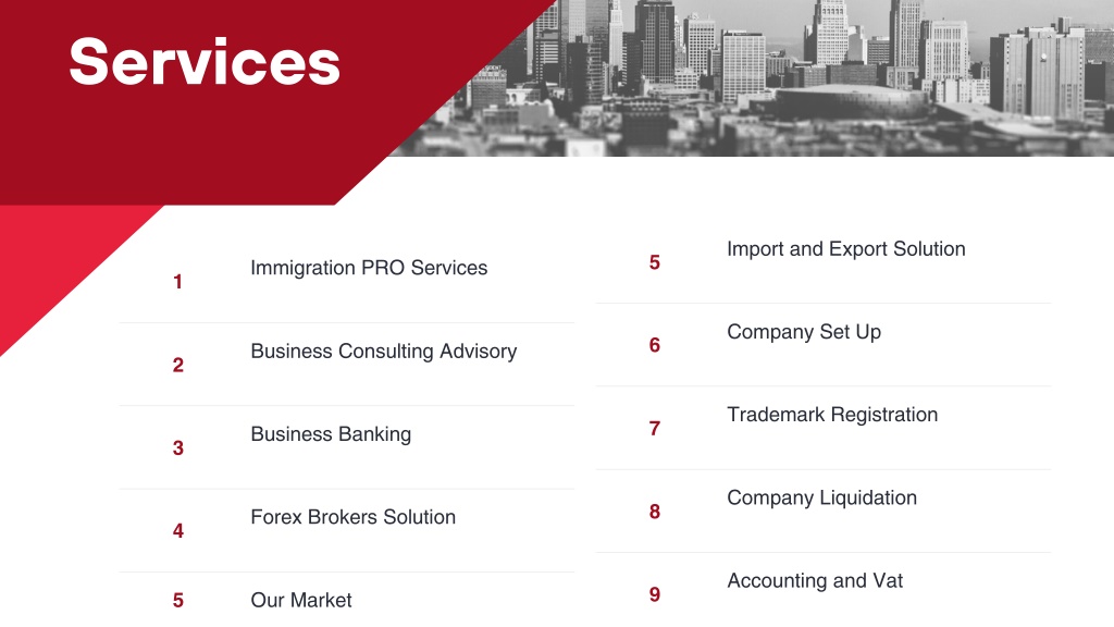 Services Import and Export Solution 5 Immigration PRO Services 1 Company Set Up 6 Business Consulting Advisory 2 Trademark Registration 7 Business Banking 3 Company Liquidation 8 Forex Brokers Solution 4 Accounting and Vat 9 5 Our Market