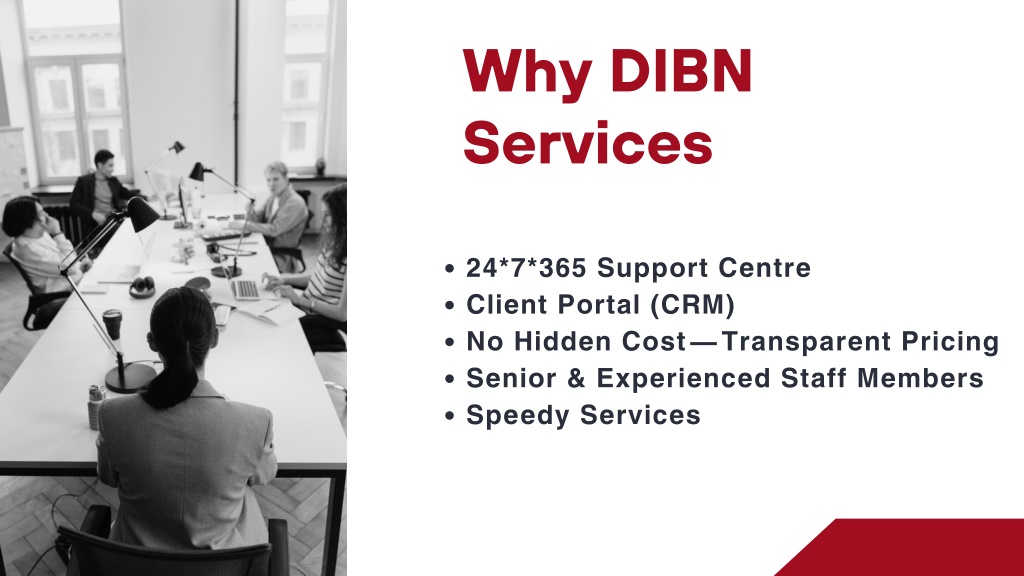 Why DIBN Services 24*7*365 Support Centre Client Portal (CRM) No Hidden Cost — Transparent Pricing Senior & Experienced Staff Members Speedy Services