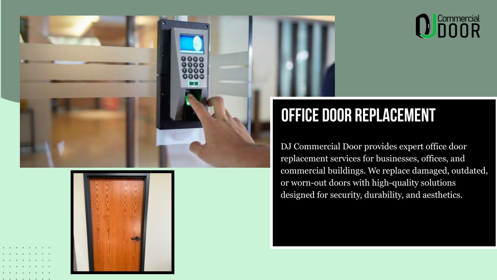 4. Office Door Replacement • DJ Commercial Door provides expert office door replacement services for businesses, offices, and commercial buildings. We replace damaged, outdated, or worn-out doors with high-quality solutions designed for security, durability, and aesthetics.