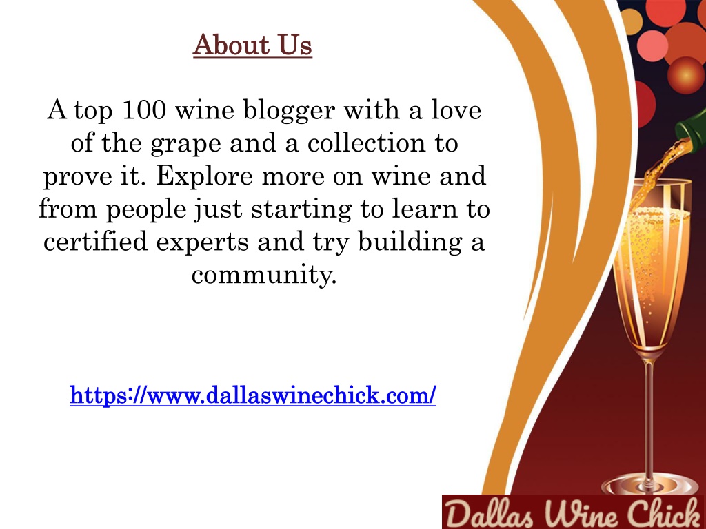 About Us A top 100 wine blogger with a love of the grape and a collection to prove it. Explore more on wine and from people just starting to learn to certified experts and try building a community. https://www.dallaswinechick.com/