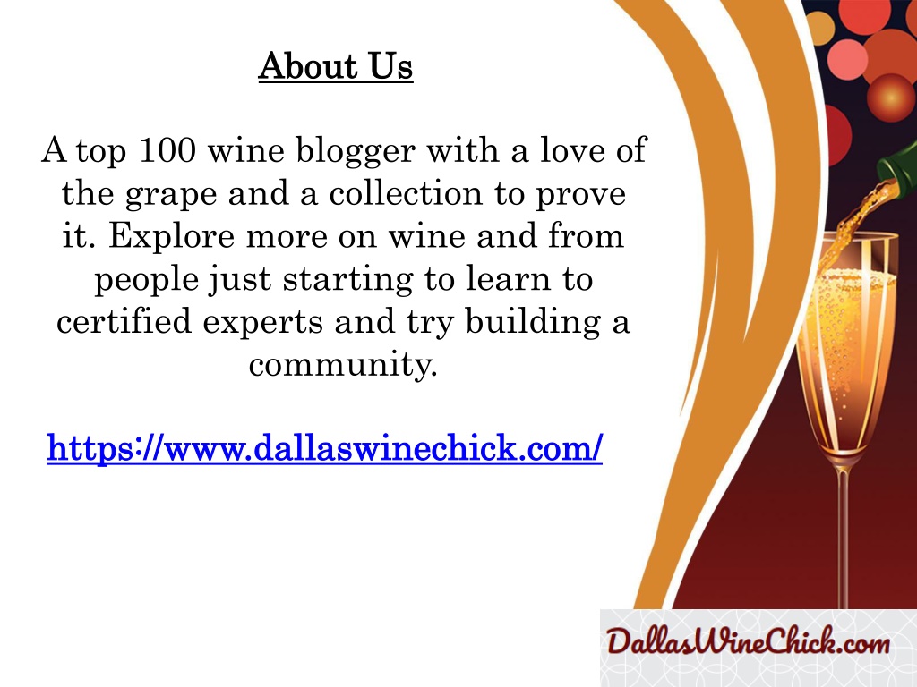 About Us A top 100 wine blogger with a love of the grape and a collection to prove it. Explore more on wine and from people just starting to learn to certified experts and try building a community. https://www.dallaswinechick.com/