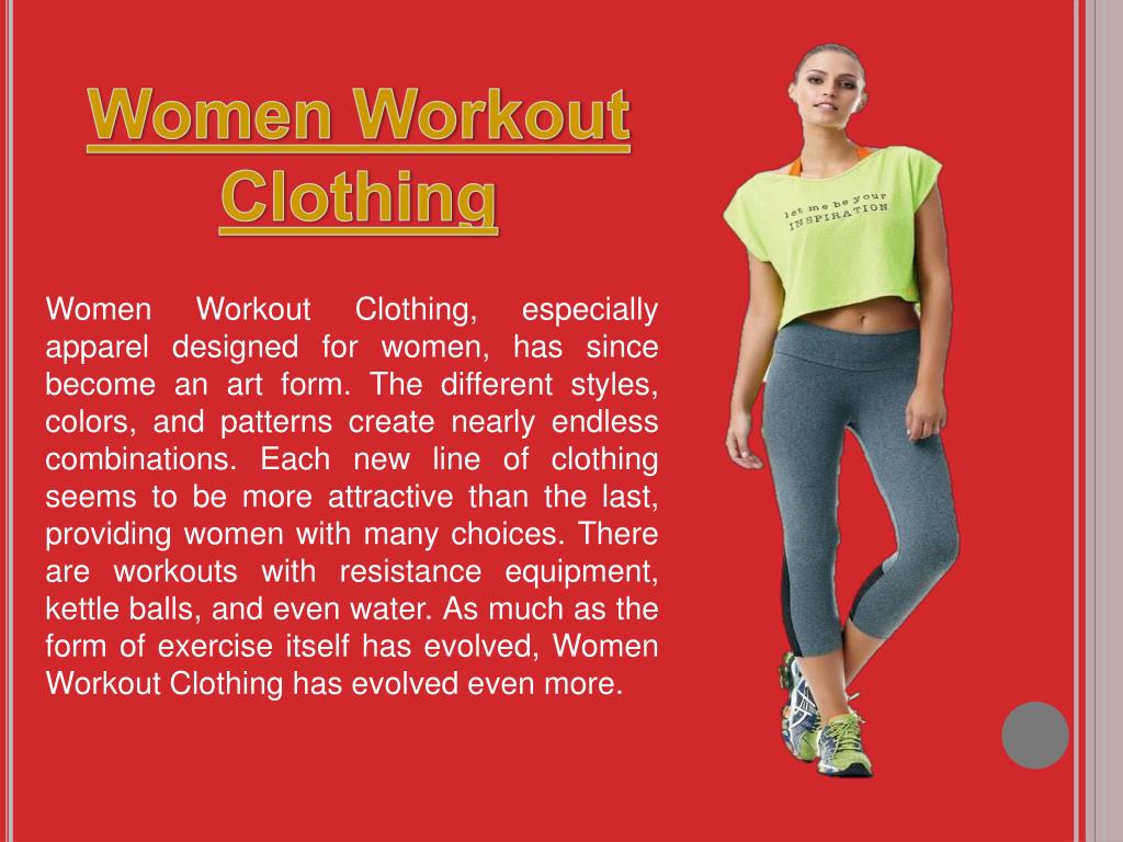 Women Workout Clothing Women Workout Clothing, especially apparel designed for women, has since become an art form. The different styles, colors, and patterns create nearly endless combinations. Each new line of clothing seems to be more attractive than the last, providing women with many choices. There are workouts with resistance equipment, kettle balls, and even water. As much as the form of exercise itself has evolved, Women Workout Clothing has evolved even more.