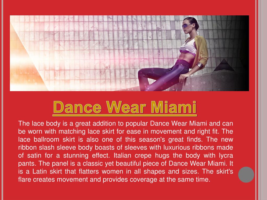 Dance Wear Miami The lace body is a great addition to popular Dance Wear Miami and can be worn with matching lace skirt for ease in movement and right fit. The lace ballroom skirt is also one of this season's great finds. The new ribbon slash sleeve body boasts of sleeves with luxurious ribbons made of satin for a stunning effect. Italian crepe hugs the body with lycra pants. The panel is a classic yet beautiful piece of Dance Wear Miami. It is a Latin skirt that flatters women in all shapes and sizes. The skirt's flare creates movement and provides coverage at the same time.