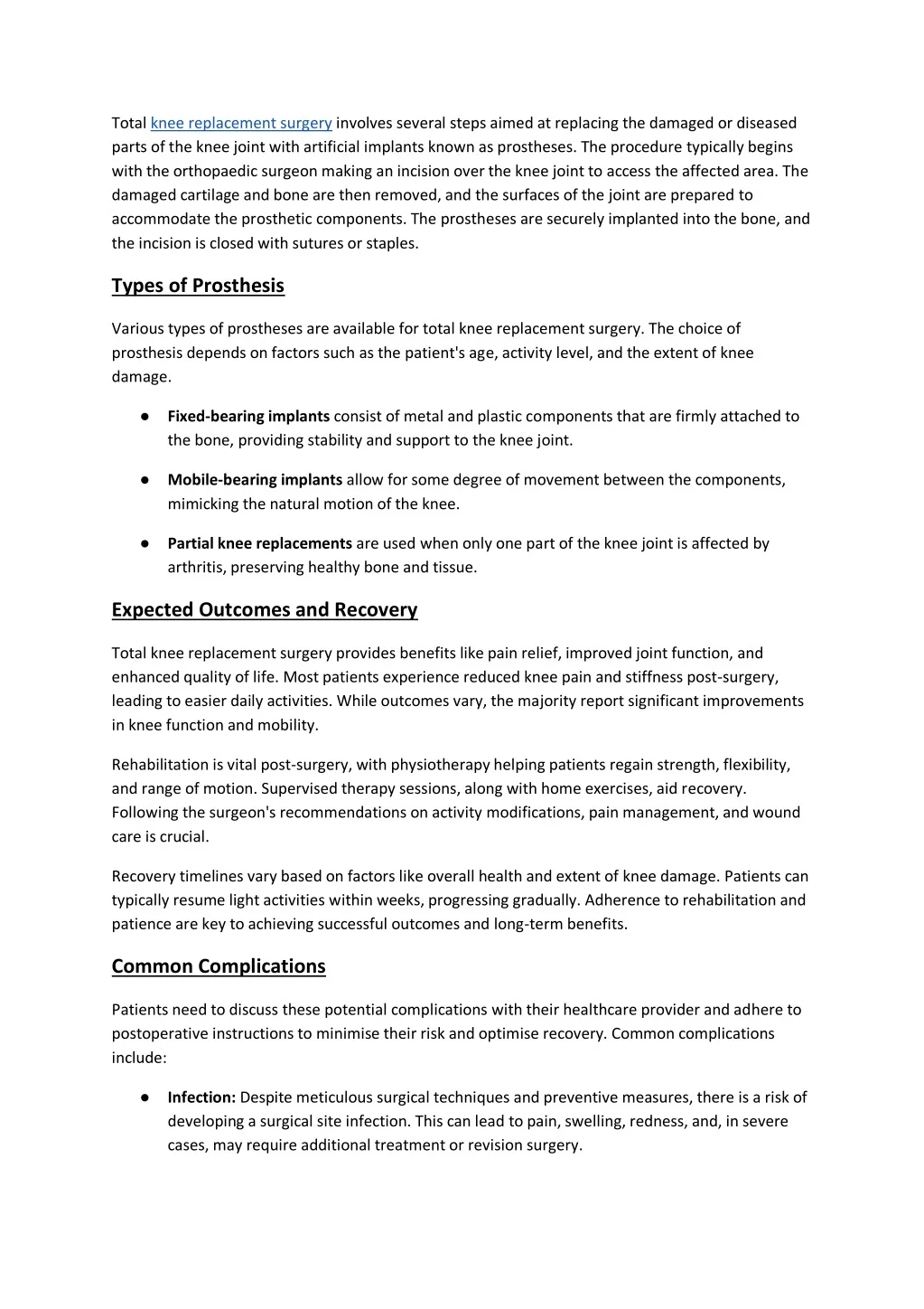 Total knee replacement surgery involves several steps aimed at replacing the damaged or diseased parts of the knee joint with artificial implants known as prostheses. The procedure typically begins with the orthopaedic surgeon making an incision over the knee joint to access the affected area. The damaged cartilage and bone are then removed, and the surfaces of the joint are prepared to accommodate the prosthetic components. The prostheses are securely implanted into the bone, and the incision is closed with sutures or staples. Types of Prosthesis Various types of prostheses are available for total knee replacement surgery. The choice of prosthesis depends on factors such as the patient's age, activity level, and the extent of knee damage. ●Fixed-bearing implants consist of metal and plastic components that are firmly attached to the bone, providing stability and support to the knee joint. ●Mobile-bearing implants allow for some degree of movement between the components, mimicking the natural motion of the knee. ●Partial knee replacements are used when only one part of the knee joint is affected by arthritis, preserving healthy bone and tissue. Expected Outcomes and Recovery Total knee replacement surgery provides benefits like pain relief, improved joint function, and enhanced quality of life. Most patients experience reduced knee pain and stiffness post-surgery, leading to easier daily activities. While outcomes vary, the majority report significant improvements in knee function and mobility. Rehabilitation is vital post-surgery, with physiotherapy helping patients regain strength, flexibility, and range of motion. Supervised therapy sessions, along with home exercises, aid recovery. Following the surgeon's recommendations on activity modifications, pain management, and wound care is crucial. Recovery timelines vary based on factors like overall health and extent of knee damage. Patients can typically resume light activities within weeks, progressing gradually. Adherence to rehabilitation and patience are key to achieving successful outcomes and long-term benefits. Common Complications Patients need to discuss these potential complications with their healthcare provider and adhere to postoperative instructions to minimise their risk and optimise recovery. Common complications include: ●Infection: Despite meticulous surgical techniques and preventive measures, there is a risk of developing a surgical site infection. This can lead to pain, swelling, redness, and, in severe cases, may require additional treatment or revision surgery.