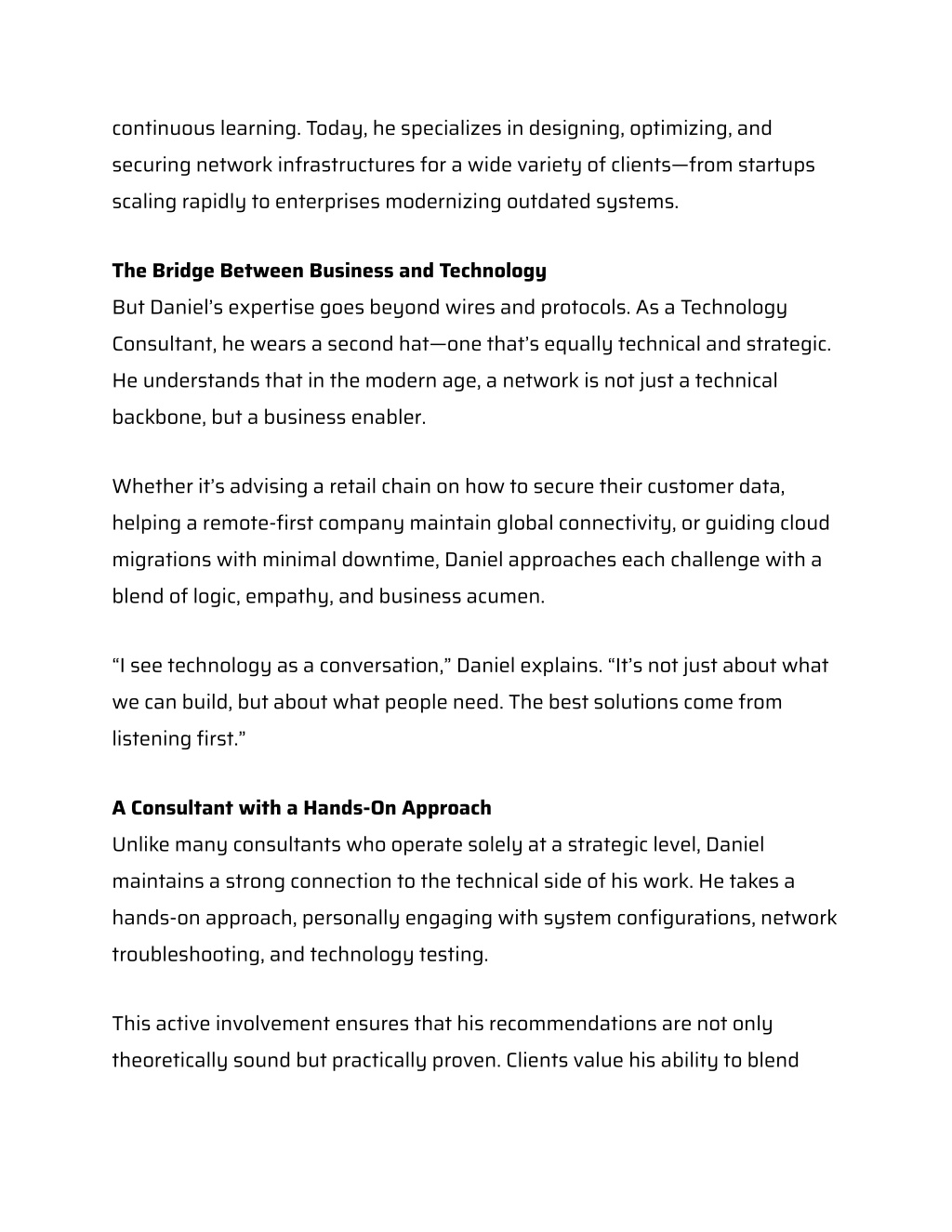 continuous learning. Today, he specializes in designing, optimizing, and securing network infrastructures for a wide variety of clients—from startups scaling rapidly to enterprises modernizing outdated systems. The Bridge Between Business and Technology But Daniel’s expertise goes beyond wires and protocols. As a Technology Consultant, he wears a second hat—one that’s equally technical and strategic. He understands that in the modern age, a network is not just a technical backbone, but a business enabler. Whether it’s advising a retail chain on how to secure their customer data, helping a remote-first company maintain global connectivity, or guiding cloud migrations with minimal downtime, Daniel approaches each challenge with a blend of logic, empathy, and business acumen. “I see technology as a conversation,” Daniel explains. “It’s not just about what we can build, but about what people need. The best solutions come from listening first.” A Consultant with a Hands-On Approach Unlike many consultants who operate solely at a strategic level, Daniel maintains a strong connection to the technical side of his work. He takes a hands-on approach, personally engaging with system configurations, network troubleshooting, and technology testing. This active involvement ensures that his recommendations are not only theoretically sound but practically proven. Clients value his ability to blend