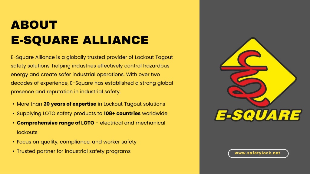 ABOUT E-SQUARE ALLIANCE E-Square Alliance is a globally trusted provider of Lockout Tagout safety solutions, helping industries effectively control hazardous energy and create safer industrial operations. With over two decades of experience, E-Square has established a strong global presence and reputation in industrial safety. • More than 20 years of expertise in Lockout Tagout solutions • Supplying LOTO safety products to 108+ countries worldwide • Comprehensive range of LOTO - electrical and mechanical lockouts • Focus on quality, compliance, and worker safety • Trusted partner for industrial safety programs www.safetylock.net
