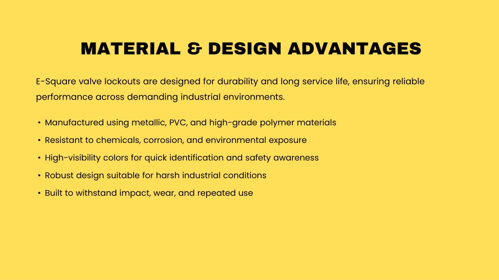 MATERIAL & DESIGN ADVANTAGES E-Square valve lockouts are designed for durability and long service life, ensuring reliable performance across demanding industrial environments. • Manufactured using metallic, PVC, and high-grade polymer materials • Resistant to chemicals, corrosion, and environmental exposure • High-visibility colors for quick identification and safety awareness • Robust design suitable for harsh industrial conditions • Built to withstand impact, wear, and repeated use