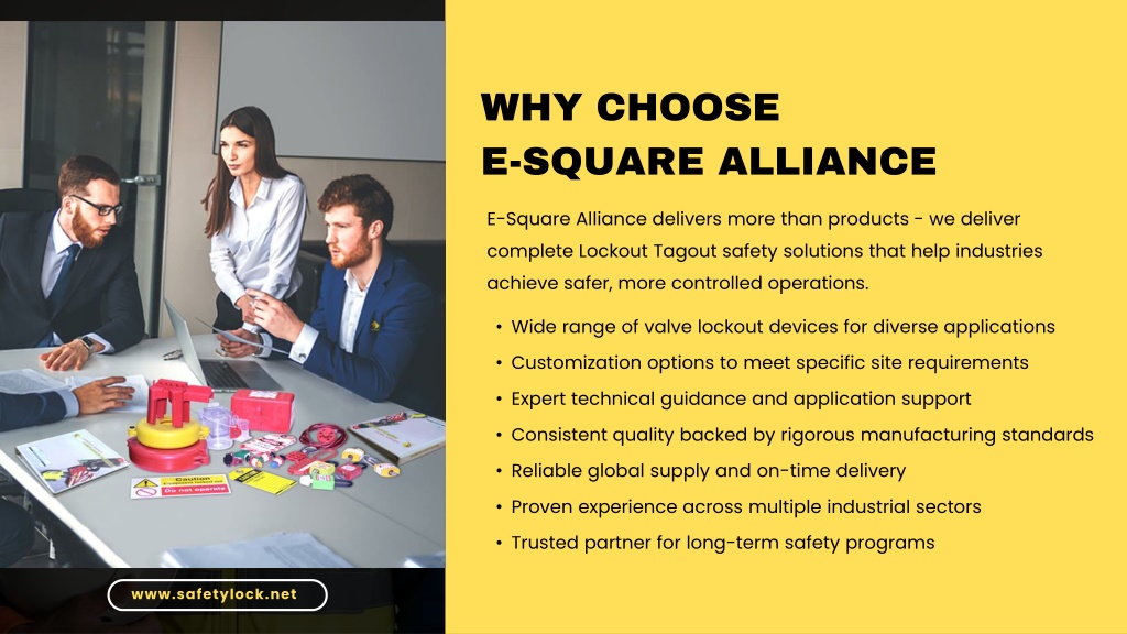WHY CHOOSE E-SQUARE ALLIANCE E-Square Alliance delivers more than products - we deliver complete Lockout Tagout safety solutions that help industries achieve safer, more controlled operations. • Wide range of valve lockout devices for diverse applications • Customization options to meet specific site requirements • Expert technical guidance and application support • Consistent quality backed by rigorous manufacturing standards • Reliable global supply and on-time delivery • Proven experience across multiple industrial sectors • Trusted partner for long-term safety programs www.safetylock.net