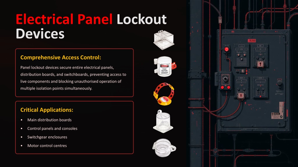 Electrical Panel Lockout Devices Comprehensive Access Control: Panel lockout devices secure entire electrical panels, distribution boards, and switchboards, preventing access to live components and blocking unauthorised operation of multiple isolation points simultaneously. Critical Applications: • Main distribution boards • Control panels and consoles • Switchgear enclosures • Motor control centres