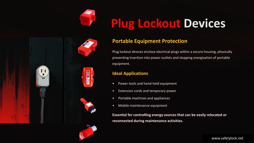 Plug LockoutDevices Portable Equipment Protection Plug lockout devices enclose electrical plugs within a secure housing, physically preventing insertion into power outlets and stopping energisation of portable equipment. Ideal Applications • Power tools and hand-held equipment • Extension cords and temporary power • Portable machines and appliances • Mobile maintenance equipment Essential for controlling energy sources that can be easily relocated or reconnected during maintenance activities. www.safetylock.net