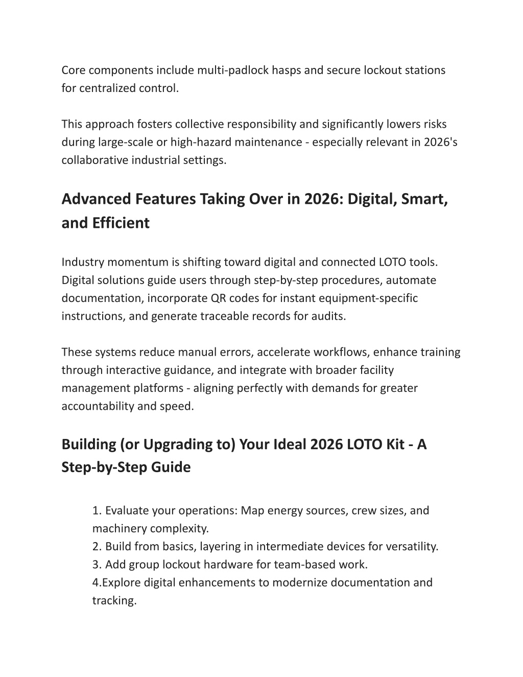 4. Core components include multi-padlock hasps and secure lockout stations for centralized control. This approach fosters collective responsibility and significantly lowers risks during large-scale or high-hazard maintenance - especially relevant in 2026's collaborative industrial settings. Advanced Features Taking Over in 2026: Digital, Smart, and Efficient Industry momentum is shifting toward digital and connected LOTO tools. Digital solutions guide users through step-by-step procedures, automate documentation, incorporate QR codes for instant equipment-specific instructions, and generate traceable records for audits. These systems reduce manual errors, accelerate workflows, enhance training through interactive guidance, and integrate with broader facility management platforms - aligning perfectly with demands for greater accountability and speed. Building (or Upgrading to) Your Ideal 2026 LOTO Kit - A Step-by-Step Guide 1.Evaluate your operations: Map energy sources, crew sizes, and machinery complexity. 2.Build from basics, layering in intermediate devices for versatility. 3.Add group lockout hardware for team-based work. 4.Explore digital enhancements to modernize documentation and tracking.
