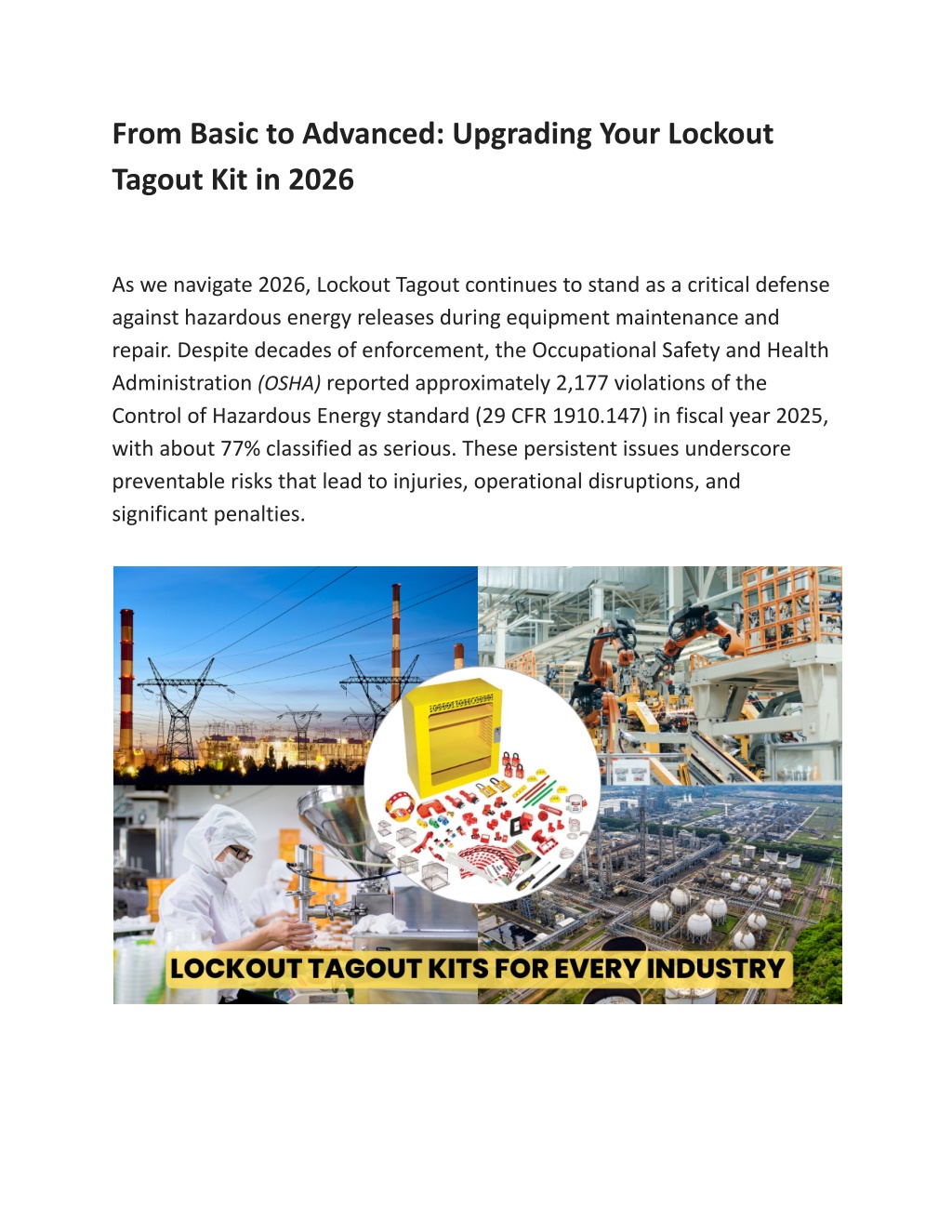 1. From Basic to Advanced: Upgrading Your Lockout Tagout Kit in 2026 As we navigate 2026, Lockout Tagout continues to stand as a critical defense against hazardous energy releases during equipment maintenance and repair. Despite decades of enforcement, the Occupational Safety and Health Administration (OSHA) reported approximately 2,177 violations of the Control of Hazardous Energy standard (29 CFR 1910.147) in fiscal year 2025, with about 77% classified as serious. These persistent issues underscore preventable risks that lead to injuries, operational disruptions, and significant penalties.