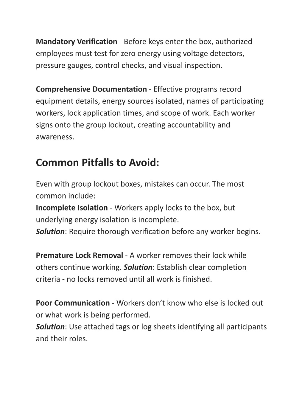 Mandatory Verification - Before keys enter the box, authorized employees must test for zero energy using voltage detectors, pressure gauges, control checks, and visual inspection. Comprehensive Documentation - Effective programs record equipment details, energy sources isolated, names of participating workers, lock application times, and scope of work. Each worker signs onto the group lockout, creating accountability and awareness. Common Pitfalls to Avoid: Even with group lockout boxes, mistakes can occur. The most common include: Incomplete Isolation - Workers apply locks to the box, but underlying energy isolation is incomplete. Solution: Require thorough verification before any worker begins. Premature Lock Removal - A worker removes their lock while others continue working. Solution: Establish clear completion criteria - no locks removed until all work is finished. Poor Communication - Workers don’t know who else is locked out or what work is being performed. Solution: Use attached tags or log sheets identifying all participants and their roles.