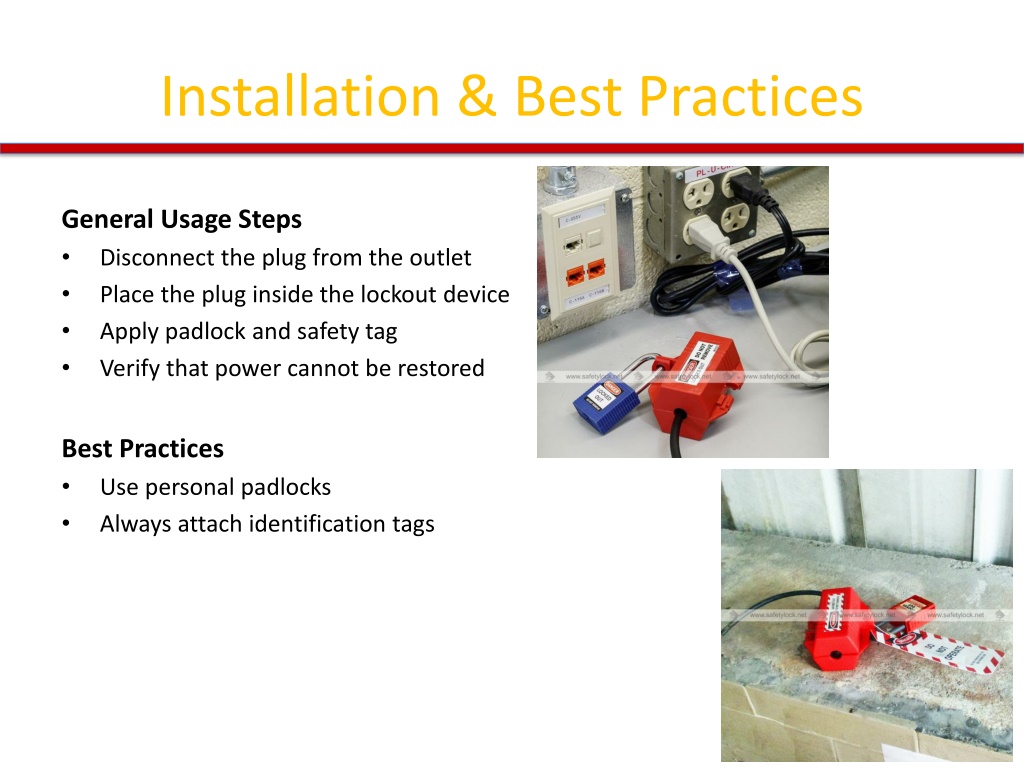 Installation & Best Practices General Usage Steps • Disconnect the plug from the outlet • Place the plug inside the lockout device • Apply padlock and safety tag • Verify that power cannot be restored Best Practices • Use personal padlocks • Always attach identification tags
