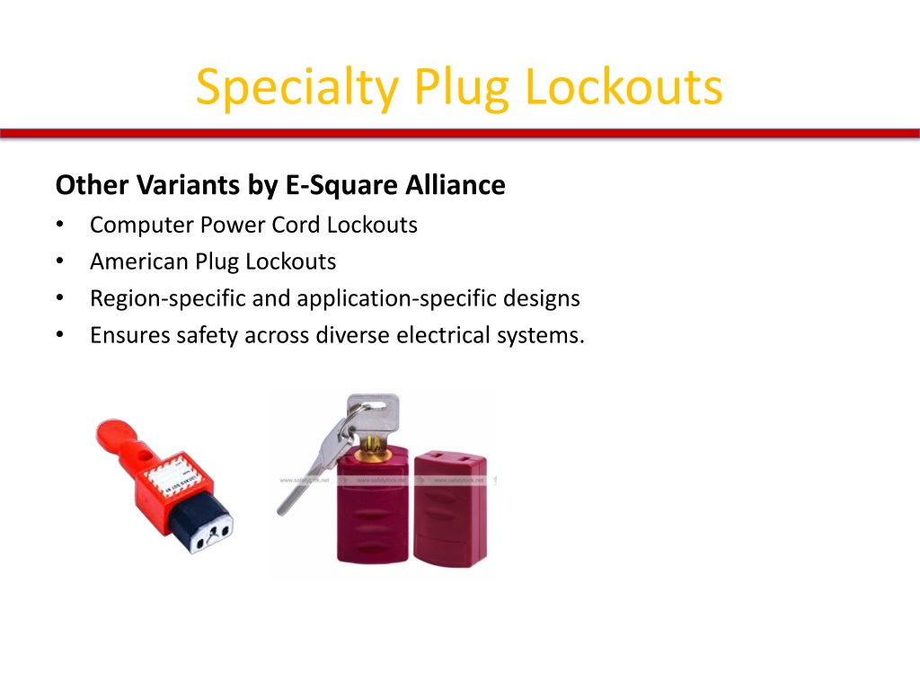 Specialty Plug Lockouts Other Variants by E-Square Alliance • Computer Power Cord Lockouts • American Plug Lockouts • Region-specific and application-specific designs • Ensures safety across diverse electrical systems.