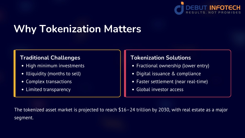 Why Tokenization Matters Traditional Challenges High minimum investments Illiquidity (months to sell) Complex transactions Limited transparency Tokenization Solutions Fractional ownership (lower entry) Digital issuance & compliance Faster settlement (near real-time) Global investor access The tokenized asset market is projected to reach $16–24 trillion by 2030, with real estate as a major segment.