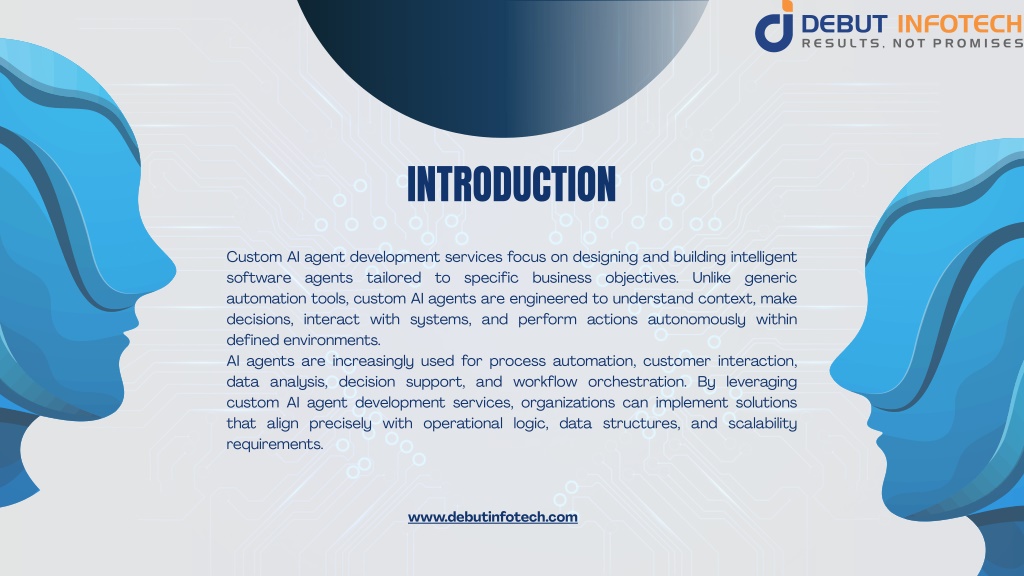 INTRODUCTION Custom AI agent development services focus on designing and building intelligent software agents tailored to specific business objectives. Unlike generic automation tools, custom AI agents are engineered to understand context, make decisions, interact with systems, and perform actions autonomously within defined environments. AI agents are increasingly used for process automation, customer interaction, data analysis, decision support, and workflow orchestration. By leveraging custom AI agent development services, organizations can implement solutions that align precisely with operational logic, data structures, and scalability requirements. www.debutinfotech.com
