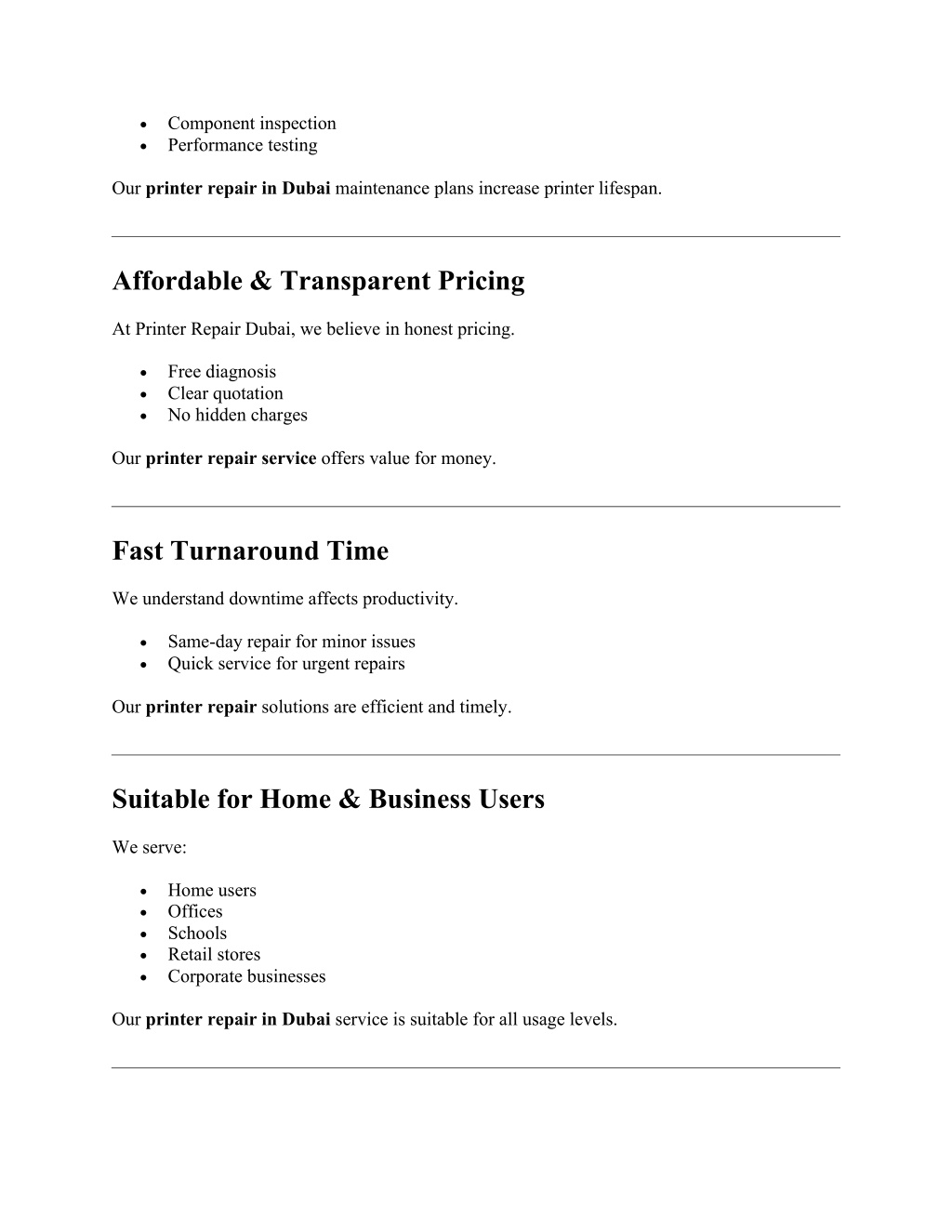 •Component inspection •Performance testing Our printer repair in Dubai maintenance plans increase printer lifespan. Affordable & Transparent Pricing At Printer Repair Dubai, we believe in honest pricing. •Free diagnosis •Clear quotation •No hidden charges Our printer repair service offers value for money. Fast Turnaround Time We understand downtime affects productivity. •Same-day repair for minor issues •Quick service for urgent repairs Our printer repair solutions are efficient and timely. Suitable for Home & Business Users We serve: •Home users •Offices •Schools •Retail stores •Corporate businesses Our printer repair in Dubai service is suitable for all usage levels.