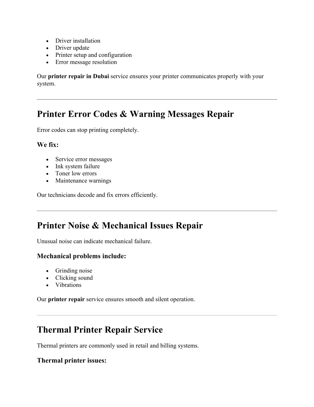•Driver installation •Driver update •Printer setup and configuration •Error message resolution Our printer repair in Dubai service ensures your printer communicates properly with your system. Printer Error Codes & Warning Messages Repair Error codes can stop printing completely. We fix: •Service error messages •Ink system failure •Toner low errors •Maintenance warnings Our technicians decode and fix errors efficiently. Printer Noise & Mechanical Issues Repair Unusual noise can indicate mechanical failure. Mechanical problems include: •Grinding noise •Clicking sound •Vibrations Our printer repair service ensures smooth and silent operation. Thermal Printer Repair Service Thermal printers are commonly used in retail and billing systems. Thermal printer issues: