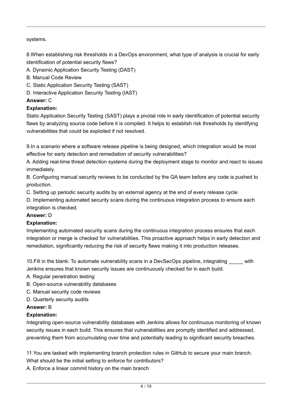systems. 8.When establishing risk thresholds in a DevOps environment, what type of analysis is crucial for early identification of potential security flaws? A. Dynamic Application Security Testing (DAST) B. Manual Code Review C. Static Application Security Testing (SAST) D. Interactive Application Security Testing (IAST) Answer: C Explanation: Static Application Security Testing (SAST) plays a pivotal role in early identification of potential security flaws by analyzing source code before it is compiled. It helps to establish risk thresholds by identifying vulnerabilities that could be exploited if not resolved. 9.In a scenario where a software release pipeline is being designed, which integration would be most effective for early detection and remediation of security vulnerabilities? A. Adding real-time threat detection systems during the deployment stage to monitor and react to issues immediately. B. Configuring manual security reviews to be conducted by the QA team before any code is pushed to production. C. Setting up periodic security audits by an external agency at the end of every release cycle. D. Implementing automated security scans during the continuous integration process to ensure each integration is checked. Answer: D Explanation: Implementing automated security scans during the continuous integration process ensures that each integration or merge is checked for vulnerabilities. This proactive approach helps in early detection and remediation, significantly reducing the risk of security flaws making it into production releases. 10.Fill in the blank: To automate vulnerability scans in a DevSecOps pipeline, integrating _____ with Jenkins ensures that known security issues are continuously checked for in each build. A. Regular penetration testing B. Open-source vulnerability databases C. Manual security code reviews D. Quarterly security audits Answer: B Explanation: Integrating open-source vulnerability databases with Jenkins allows for continuous monitoring of known security issues in each build. This ensures that vulnerabilities are promptly identified and addressed, preventing them from accumulating over time and potentially leading to significant security breaches. 11.You are tasked with implementing branch protection rules in GitHub to secure your main branch. What should be the initial setting to enforce for contributors? A. Enforce a linear commit history on the main branch 4 / 10