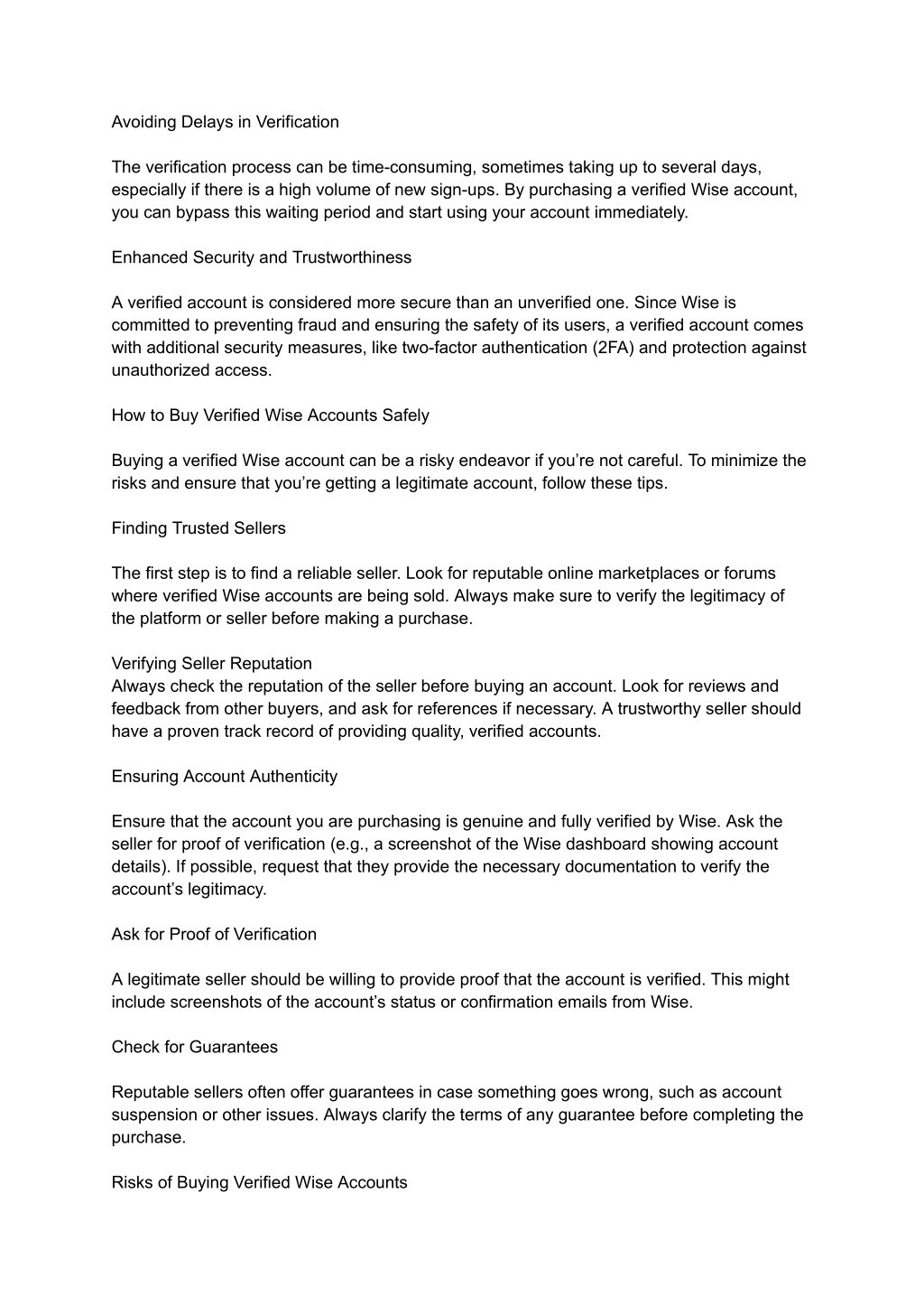 Avoiding Delays in Verification The verification process can be time-consuming, sometimes taking up to several days, especially if there is a high volume of new sign-ups. By purchasing a verified Wise account, you can bypass this waiting period and start using your account immediately. Enhanced Security and Trustworthiness A verified account is considered more secure than an unverified one. Since Wise is committed to preventing fraud and ensuring the safety of its users, a verified account comes with additional security measures, like two-factor authentication (2FA) and protection against unauthorized access. How to Buy Verified Wise Accounts Safely Buying a verified Wise account can be a risky endeavor if you’re not careful. To minimize the risks and ensure that you’re getting a legitimate account, follow these tips. Finding Trusted Sellers The first step is to find a reliable seller. Look for reputable online marketplaces or forums where verified Wise accounts are being sold. Always make sure to verify the legitimacy of the platform or seller before making a purchase. Verifying Seller Reputation Always check the reputation of the seller before buying an account. Look for reviews and feedback from other buyers, and ask for references if necessary. A trustworthy seller should have a proven track record of providing quality, verified accounts. Ensuring Account Authenticity Ensure that the account you are purchasing is genuine and fully verified by Wise. Ask the seller for proof of verification (e.g., a screenshot of the Wise dashboard showing account details). If possible, request that they provide the necessary documentation to verify the account’s legitimacy. Ask for Proof of Verification A legitimate seller should be willing to provide proof that the account is verified. This might include screenshots of the account’s status or confirmation emails from Wise. Check for Guarantees Reputable sellers often offer guarantees in case something goes wrong, such as account suspension or other issues. Always clarify the terms of any guarantee before completing the purchase. Risks of Buying Verified Wise Accounts