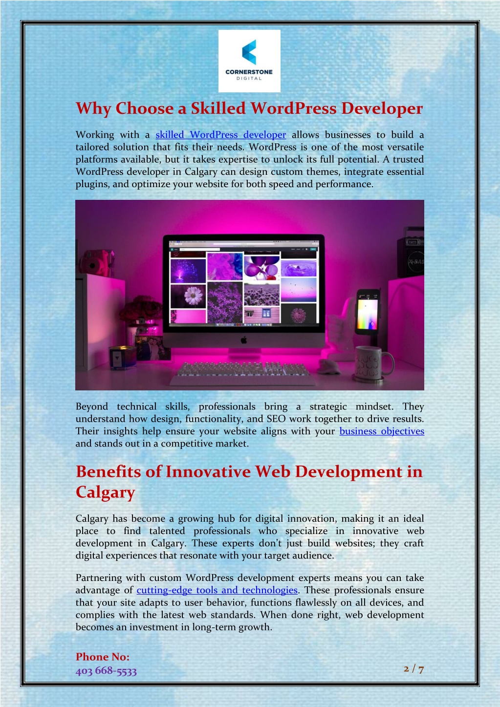 Why Choose a Skilled WordPress Developer Working with a skilled WordPress developer allows businesses to build a tailored solution that fits their needs. WordPress is one of the most versatile platforms available, but it takes expertise to unlock its full potential. A trusted WordPress developer in Calgary can design custom themes, integrate essential plugins, and optimize your website for both speed and performance. Beyond technical skills, professionals bring a strategic mindset. They understand how design, functionality, and SEO work together to drive results. Their insights help ensure your website aligns with your business objectives and stands out in a competitive market. Benefits of Innovative Web Development in Calgary Calgary has become a growing hub for digital innovation, making it an ideal place to find talented professionals who specialize in innovative web development in Calgary. These experts don’t just build websites; they craft digital experiences that resonate with your target audience. Partnering with custom WordPress development experts means you can take advantage of cutting-edge tools and technologies. These professionals ensure that your site adapts to user behavior, functions flawlessly on all devices, and complies with the latest web standards. When done right, web development becomes an investment in long-term growth. Phone No: 403 668-5533 2 / 7