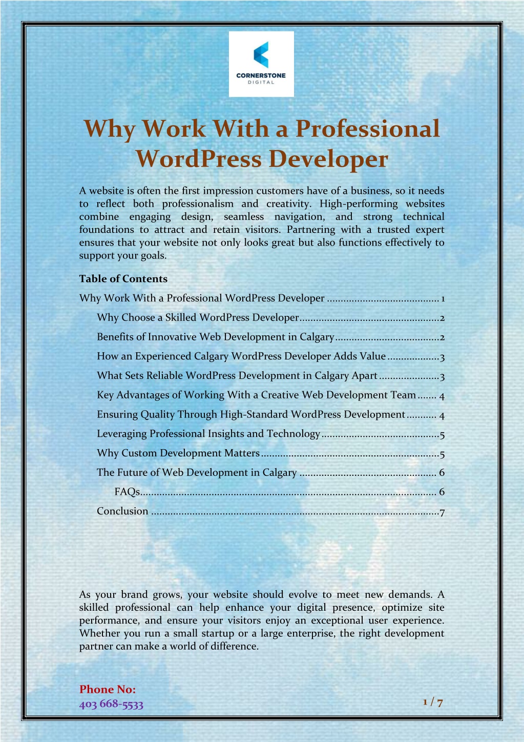 Why Work With a Professional WordPress Developer A website is often the first impression customers have of a business, so it needs to reflect both professionalism and creativity. High-performing websites combine engaging design, seamless navigation, and strong technical foundations to attract and retain visitors. Partnering with a trusted expert ensures that your website not only looks great but also functions effectively to support your goals. Table of Contents Why Work With a Professional WordPress Developer ......................................... 1 Why Choose a Skilled WordPress Developer ................................................... 2 Benefits of Innovative Web Development in Calgary ...................................... 2 How an Experienced Calgary WordPress Developer Adds Value ................... 3 What Sets Reliable WordPress Development in Calgary Apart ...................... 3 Key Advantages of Working With a Creative Web Development Team ....... 4 Ensuring Quality Through High-Standard WordPress Development ........... 4 Leveraging Professional Insights and Technology ........................................... 5 Why Custom Development Matters ................................................................. 5 The Future of Web Development in Calgary .................................................. 6 FAQs ............................................................................................................ 6 Conclusion ......................................................................................................... 7 As your brand grows, your website should evolve to meet new demands. A skilled professional can help enhance your digital presence, optimize site performance, and ensure your visitors enjoy an exceptional user experience. Whether you run a small startup or a large enterprise, the right development partner can make a world of difference. Phone No: 403 668-5533 1 / 7
