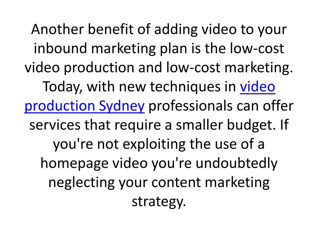 Another benefit of adding video to your inbound marketing plan is the low-cost video production and low-cost marketing. Today, with new techniques in video production Sydney professionals can offer services that require a smaller budget. If you're not exploiting the use of a homepage video you're undoubtedly neglecting your content marketing strategy.