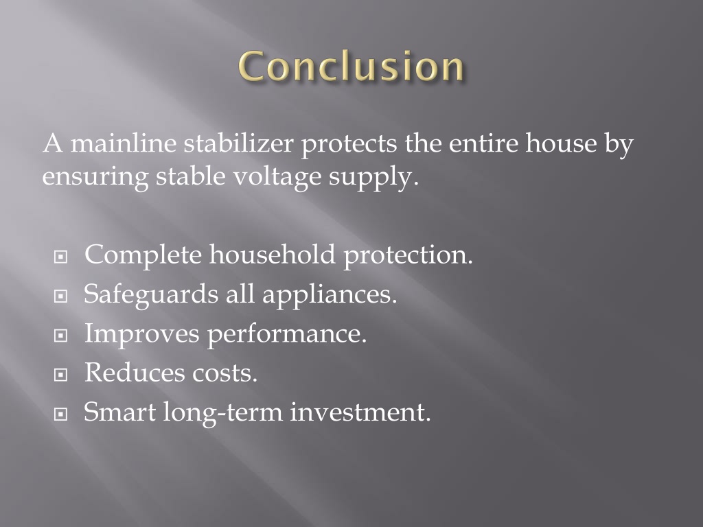 Conclusion A mainline stabilizer protects the entire house by ensuring stable voltage supply. • Complete household protection. • Safeguards all appliances. • Improves performance. • Reduces costs. • Smart long-term investment.