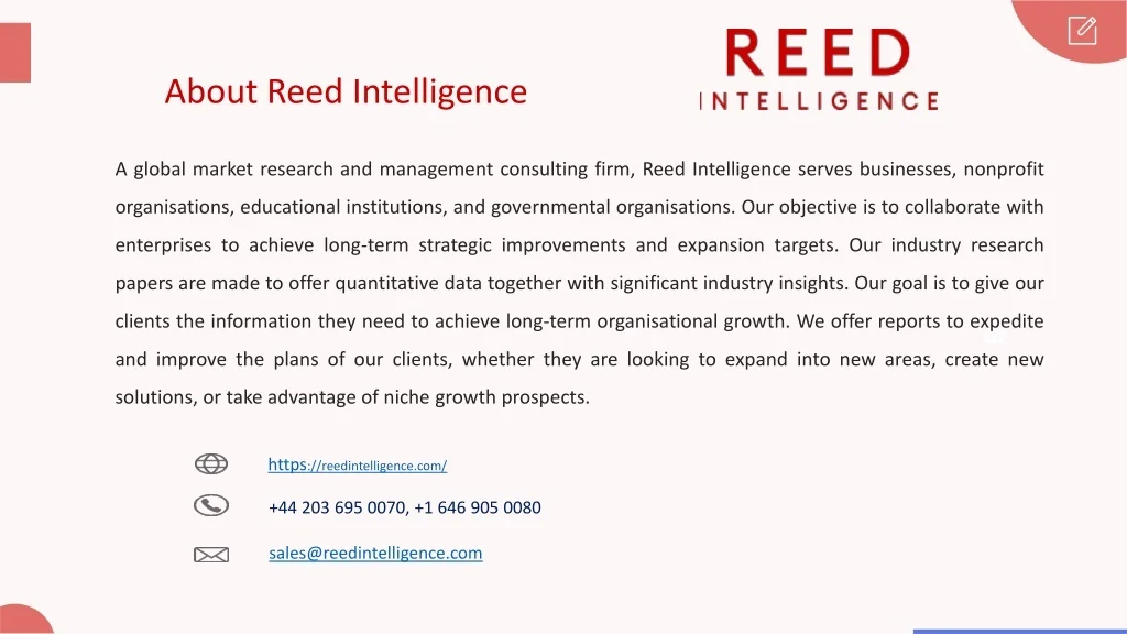 About Reed Intelligence A global market research and management consulting firm, Reed Intelligence serves businesses, nonprofit organisations, educational institutions, and governmental organisations. Our objective is to collaborate with enterprises to achieve long-term strategic improvements and expansion targets. Our industry research papers are made to offer quantitative data together with significant industry insights. Our goal is to give our clients the information they need to achieve long-term organisational growth. We offer reports to expedite and improve the plans of our clients, whether they are looking to expand into new areas, create new solutions, or take advantage of niche growth prospects. 01 https://reedintelligence.com/ +44 203 695 0070, +1 646 905 0080 sales@reedintelligence.com