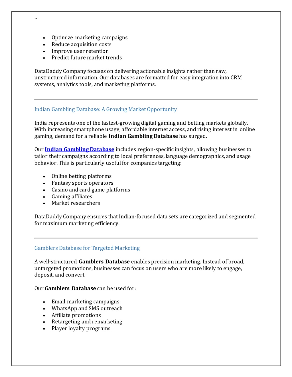 `` Optimize marketing campaigns Reduce acquisition costs Improve user retention Predict future market trends DataDaddy Company focuses on delivering actionable insights rather than raw, unstructured information. Our databases are formatted for easy integration into CRM systems, analytics tools, and marketing platforms. Indian Gambling Database: A Growing Market Opportunity India represents one of the fastest-growing digital gaming and betting markets globally. With increasing smartphone usage, affordable internet access, and rising interest in online gaming, demand for a reliable Indian Gambling Database has surged. Our Indian Gambling Database includes region-specific insights, allowing businesses to tailor their campaigns according to local preferences, language demographics, and usage behavior. This is particularly useful for companies targeting: Online betting platforms Fantasy sports operators Casino and card game platforms Gaming affiliates Market researchers DataDaddy Company ensures that Indian-focused data sets are categorized and segmented for maximum marketing efficiency. Gamblers Database for Targeted Marketing A well-structured Gamblers Database enables precision marketing. Instead of broad, untargeted promotions, businesses can focus on users who are more likely to engage, deposit, and convert. Our Gamblers Database can be used for: Email marketing campaigns WhatsApp and SMS outreach Affiliate promotions Retargeting and remarketing Player loyalty programs