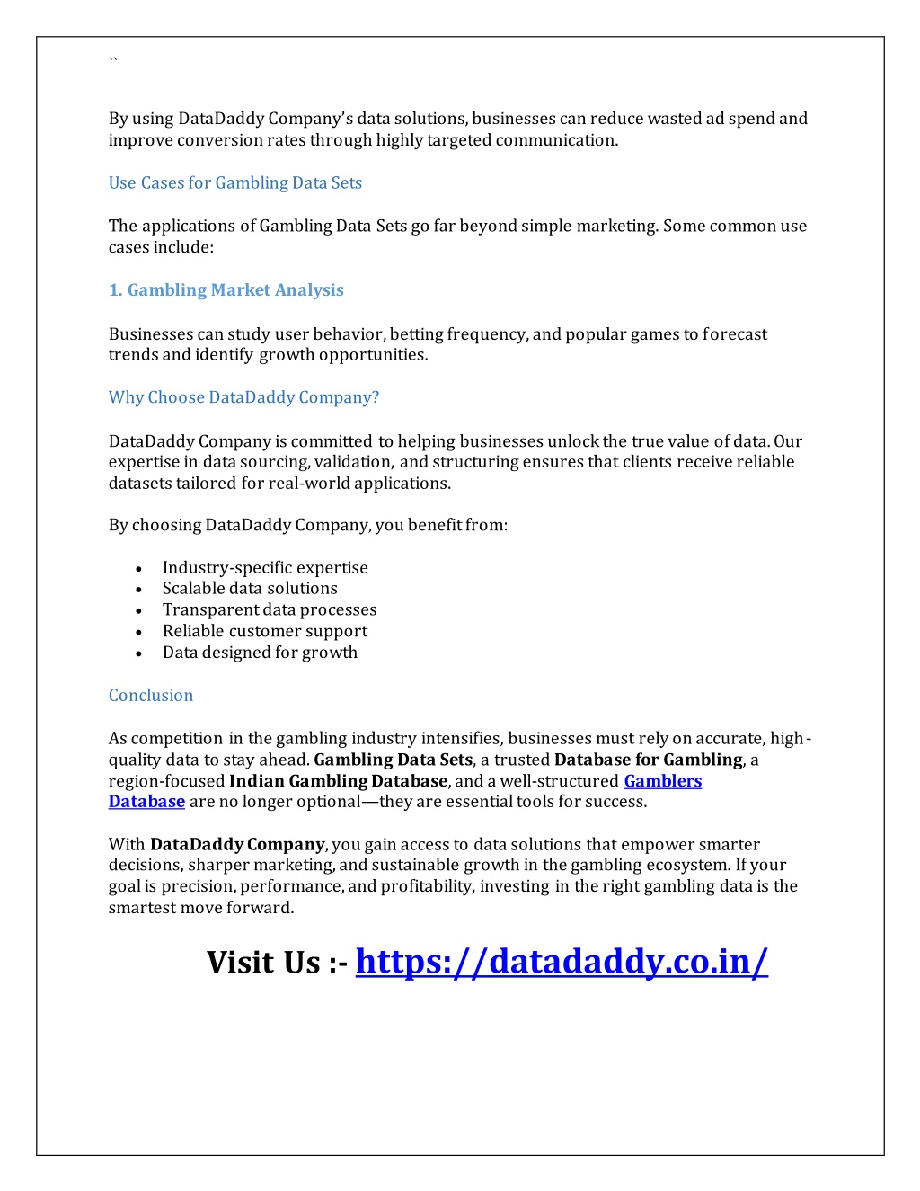 `` By using DataDaddy Company’s data solutions, businesses can reduce wasted ad spend and improve conversion rates through highly targeted communication. Use Cases for Gambling Data Sets The applications of Gambling Data Sets go far beyond simple marketing. Some common use cases include: 1. Gambling Market Analysis Businesses can study user behavior, betting frequency, and popular games to forecast trends and identify growth opportunities. Why Choose DataDaddy Company? DataDaddy Company is committed to helping businesses unlock the true value of data. Our expertise in data sourcing, validation, and structuring ensures that clients receive reliable datasets tailored for real-world applications. By choosing DataDaddy Company, you benefit from: Industry-specific expertise Scalable data solutions Transparent data processes Reliable customer support Data designed for growth Conclusion As competition in the gambling industry intensifies, businesses must rely on accurate, high- quality data to stay ahead. Gambling Data Sets, a trusted Database for Gambling, a region-focused Indian Gambling Database, and a well-structured Gamblers Database are no longer optional—they are essential tools for success. Visit Us :- https://datadaddy.co.in/ With DataDaddy Company, you gain access to data solutions that empower smarter decisions, sharper marketing, and sustainable growth in the gambling ecosystem. If your goal is precision, performance, and profitability, investing in the right gambling data is the smartest move forward.