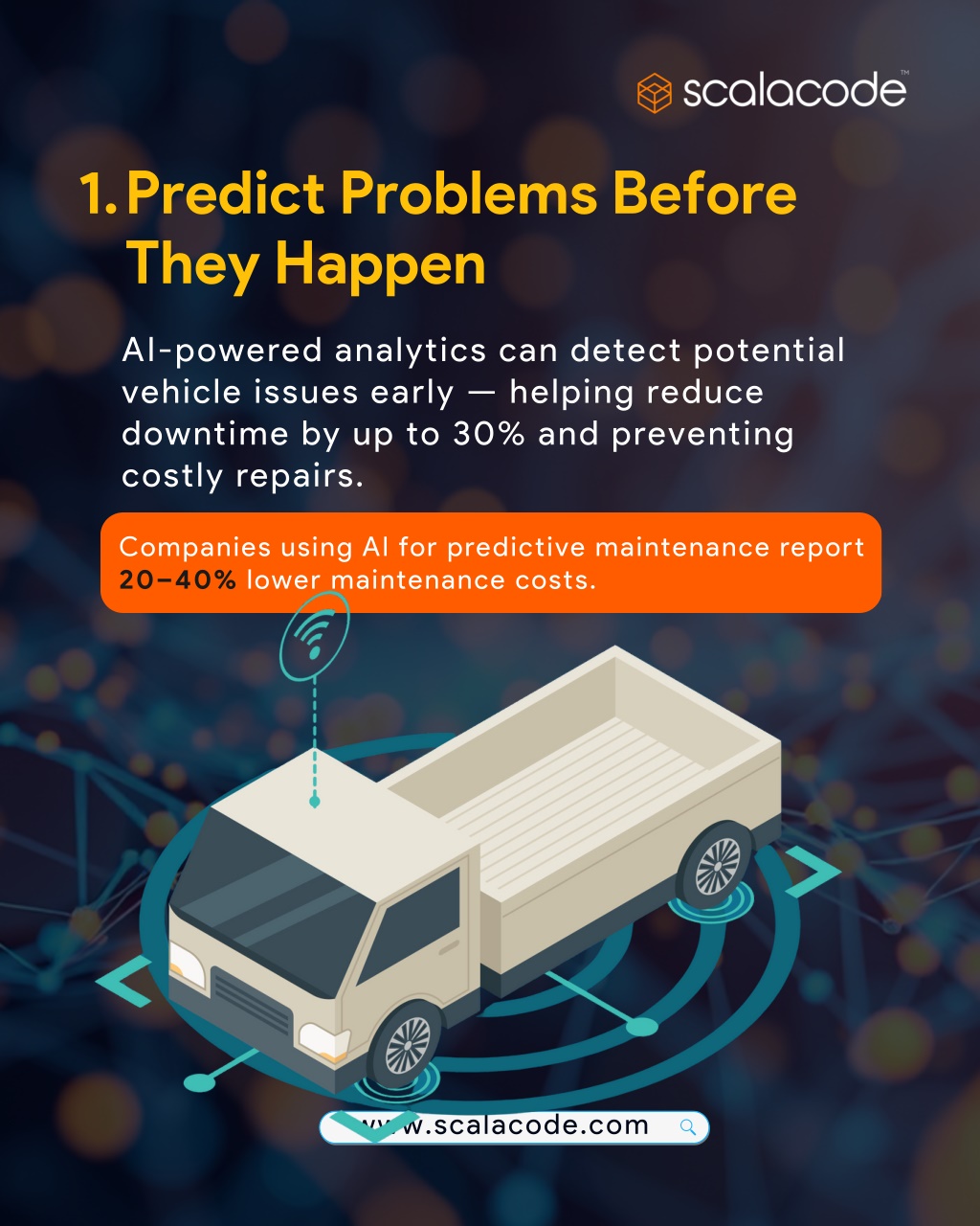 1.Predict Problems Before They Happen AI-powered analytics can detect potential vehicle issues early — helping reduce downtime by up to 30% and preventing costly repairs. Companies using AI for predictive maintenance report 20–40% lower maintenance costs. www.scalacode.com