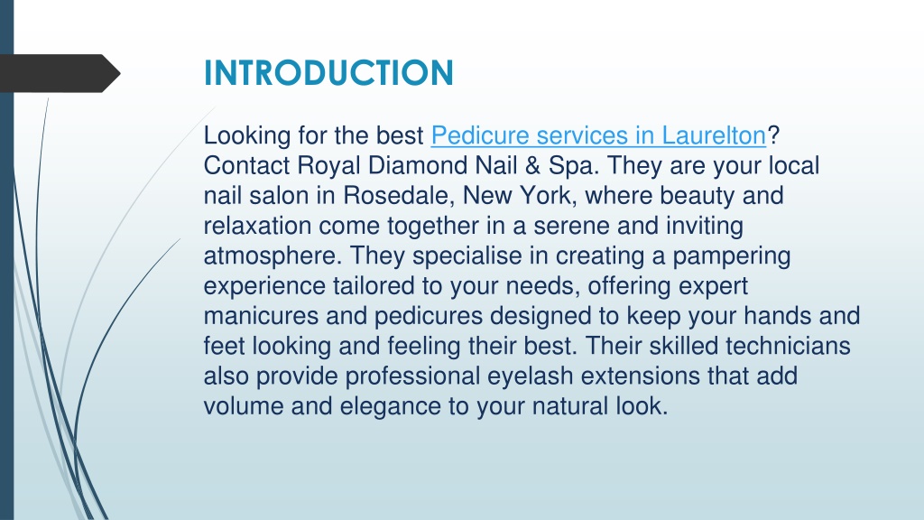 2. INTRODUCTION Looking for the best Pedicure services in Laurelton? Contact Royal Diamond Nail & Spa. They are your local nail salon in Rosedale, New York, where beauty and relaxation come together in a serene and inviting atmosphere. They specialise in creating a pampering experience tailored to your needs, offering expert manicures and pedicures designed to keep your hands and feet looking and feeling their best. Their skilled technicians also provide professional eyelash extensions that add volume and elegance to your natural look.