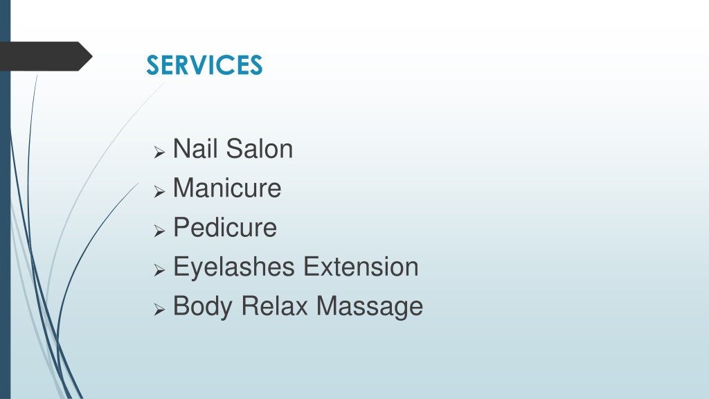 3. SERVICES • Nail Salon • Manicure • Pedicure • Eyelashes Extension • Body Relax Massage