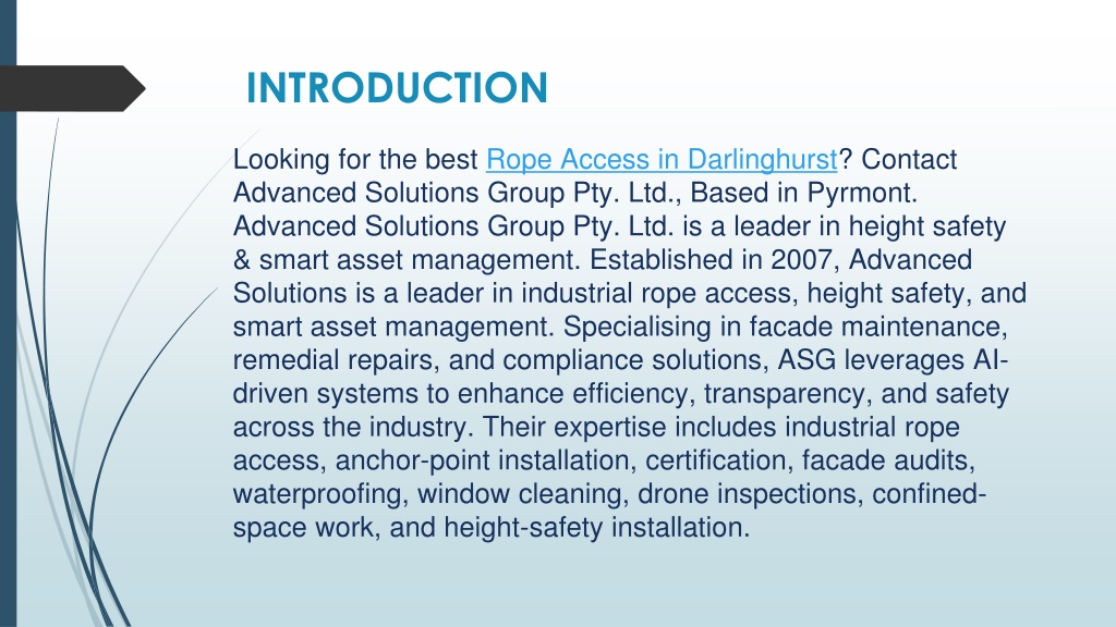 INTRODUCTION Looking for the best Rope Access in Darlinghurst? Contact Advanced Solutions Group Pty. Ltd., Based in Pyrmont. Advanced Solutions Group Pty. Ltd. is a leader in height safety & smart asset management. Established in 2007, Advanced Solutions is a leader in industrial rope access, height safety, and smart asset management. Specialising in facade maintenance, remedial repairs, and compliance solutions, ASG leverages AI-driven systems to enhance efficiency, transparency, and safety across the industry. Their expertise includes industrial rope access, anchor-point installation, certification, facade audits, waterproofing, window cleaning, drone inspections, confined-space work, and height-safety installation.