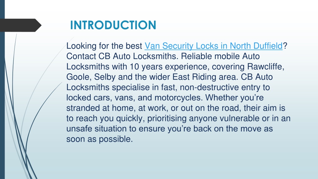 2. INTRODUCTION Looking for the best Van Security Locks in North Duffield? Contact CB Auto Locksmiths. Reliable mobile Auto Locksmiths with 10 years experience, covering Rawcliffe, Goole, Selby and the wider East Riding area. CB Auto Locksmiths specialise in fast, non-destructive entry to locked cars, vans, and motorcycles. Whether you’re stranded at home, at work, or out on the road, their aim is to reach you quickly, prioritising anyone vulnerable or in an unsafe situation to ensure you’re back on the move as soon as possible.