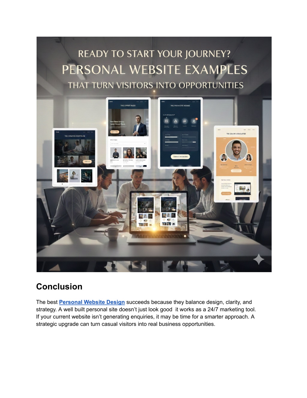Conclusion The best Personal Website Design succeeds because they balance design, clarity, and strategy. A well built personal site doesn’t just look good it works as a 24/7 marketing tool. If your current website isn’t generating enquiries, it may be time for a smarter approach. A strategic upgrade can turn casual visitors into real business opportunities.