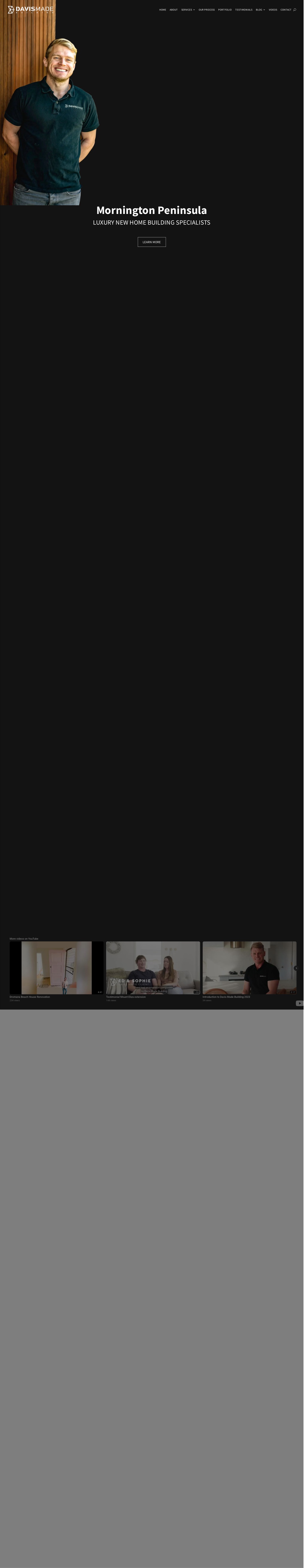 HOME ABOUT SERVICES 3 OUR PROCESS PORTFOLIO TESTIMONIALS BLOG 3 VIDEOS CONTACT U Mornington Peninsula Mornington Peninsula LUXURY NEW HOME BUILDING SPECIALISTS LUXURY NEW HOME BUILDING SPECIALISTS LEARN MORE More videos on YouTube 4:41 1:55 2:17 Dromana Beach House Renovation 234 views Testimonial Mount Eliza extension 144 views Introduction to Davis Made Building 2023 34 views