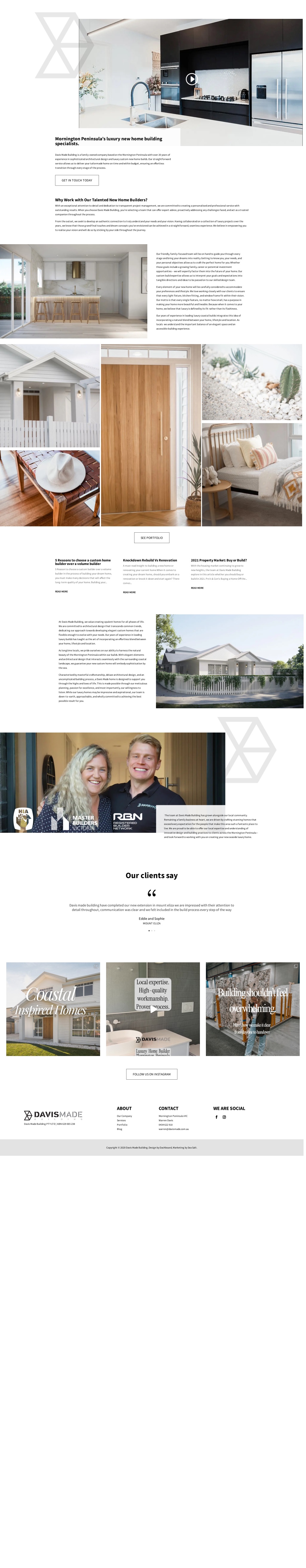 I Mornington Peninsulaʼs luxury new home building specialists. Davis Made Building is a family-owned company based on the Mornington Peninsula with over 20 years of experience in sophisticated architectural design and luxury custom new home builds. Our straightforward service allows us to deliver your tailormade home on time and within budget, ensuring an e?ortless transition through every stage of the process. GET IN TOUCH TODAY Why Work with Our Talented New Home Builders? With an exceptional attention to detail and dedication to transparent project management, we are committed to creating a personalised and professional service with outstanding results. When you choose Davis Made Building, youʼre selecting a team that can o?er expert advice, proactively addressing any challenges faced, and act as a trusted companion throughout the process. From the outset, we seek to develop an authentic connection to truly understand your needs and your vision. Having collaborated on a collection of luxury projects over the years, we know that those grand final touches and dream concepts youʼve envisioned can be achieved in a straightforward, seamless experience. We believe in empowering you to realise your vision and will do so by sticking by your side throughout the journey. Our friendly, family-focused team will be on hand to guide you through every stage and bring your dreams into reality. Getting to know you, your needs, and your personal objectives allow us to cra? the perfect home for you. Whether those goals include a growing family, career or potential investment opportunities – we will expertly factor them into the future of your home. Our custom build expertise allows us to interpret your goals and expectations into tangible directions and ideas to be passed on to our skilled design team. Every element of your new home will be carefully considered to accommodate your preferences and lifestyle. We love working closely with our clients to ensure that every light fixture, kitchen fitting, and window frame fit within their vision. Our motto is that every single feature, no matter how small, has a purpose in making your home more beautiful and liveable. Because when it comes to your home, we believe that luxury is defined by its fit rather than its flashiness. Our years of experience in leading luxury coastal builds integrates this idea of incorporating a natural blend between your home, lifestyle and location. As locals we understand the important balance of an elegant space and an accessible building experience. SEE PORTFOLIO 5 Reasons to choose a custom home builder over a volume builder Knockdown Rebuild Vs Renovation 2021 Property Market: Buy or Build? A must read insight to building a new home or renovating your current home When it comes to creating your dream home, should you embark on a renovation or knock it down and start again? There comes... With the housing market continuing to grow to new heights, the team at Davis Made Building explore in this article whether you should buy or build in 2021. Proʼs & Conʼs: Buying a Home O? the... 5 Reason to choose a custom builder over a volume builder In the process of building your dream home, you must make many decisions that will a?ect the long-term quality of your home. Building your... READ MORE READ MORE READ MORE At Davis Made Building, we value creating opulent homes for all phases of life. We are committed to architectural design that transcends common trends, dedicating our approach towards developing elegant custom homes that are flexible enough to evolve with your needs. Our years of experience in leading luxury builds has taught us the art of incorporating an e?ortless blend between your home, lifestyle and location. As longtime locals, we pride ourselves on our ability to harness the natural beauty of the Mornington Peninsula within our builds. With elegant elements and architectural design that interacts seamlessly with the surrounding coastal landscape, we guarantee your new custom home will embody sophistication by the sea. Characterised by masterful cra?smanship, deluxe architectural design, and an uncomplicated building process, a Davis Made home is designed to support you through the highs and lows of life. This is made possible through our meticulous planning, passion for excellence, and most importantly, our willingness to listen. While our luxury homes may be impressive and aspirational, our team is down-to-earth, approachable, and wholly committed to achieving the best possible result for you. The team at Davis Made Building has grown alongside our local community. Remaining a family business at heart, we are driven by cra?ing stunning homes that exceed every expectation for the people that make this area such a fantastic place to live. We are proud to be able to o?er our local expertise and understanding of innovative design and building practices to clients across the Mornington Peninsula – and look forward to working with you on creating your new seaside luxury home. Our clients say { Davis made building have completed our new extension in mount eliza we are impressed with their attention to detail throughout, communication was clear and we felt included in the build process every step of the way Eddie and Sophie MOUNT ELIZA FOLLOW US ON INSTAGRAM ABOUT CONTACT WE ARE SOCIAL Our Company Services Portfolio Blog Mornington Peninsula VIC Warren Davis 0434 622 910 warren@davismade.com.au Davis Made Building PTY LTD | ABN 629 065 238 Copyright © 2020 Davis Made Building. Design by Dachboard, Marketing by Sea Salt.